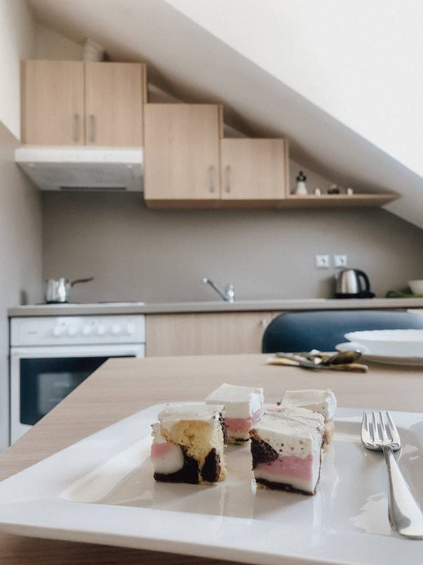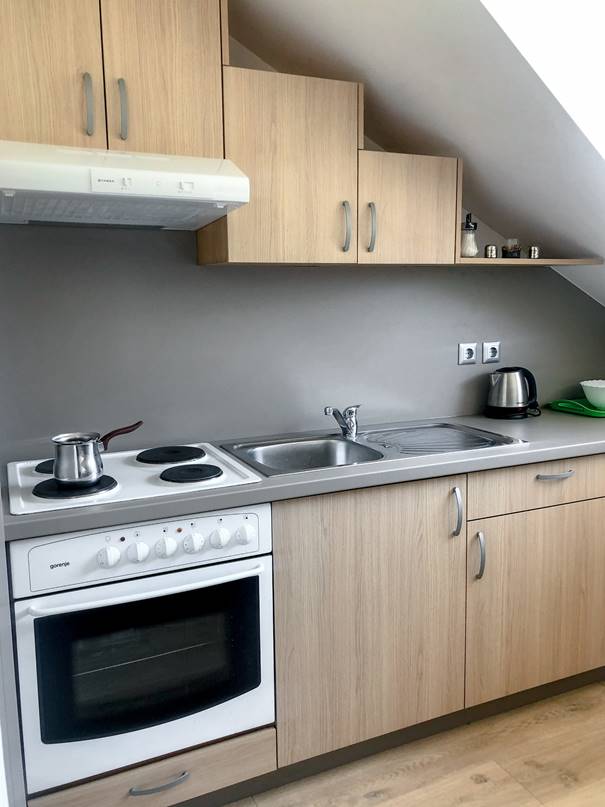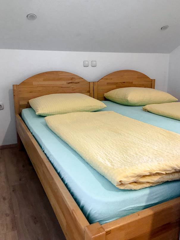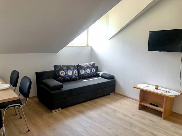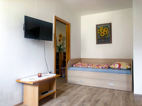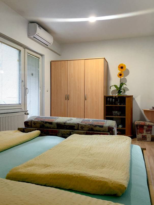1/3+2: v spalnici je francoska postelja in dodatno ležišče, ter ležišče za dve osebi v dnevnem prostoru. Apartma je klimatiziran.